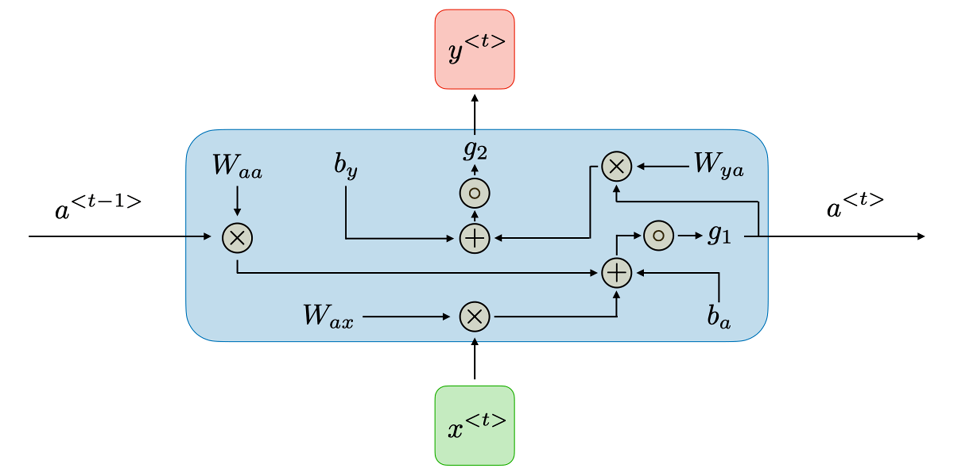 \(\boxed{a^{< t >}=g_1(W_{aa}a^{< t-1 >}+W_{ax}x^{< t >}+b_a)}\)