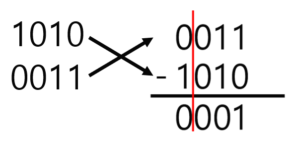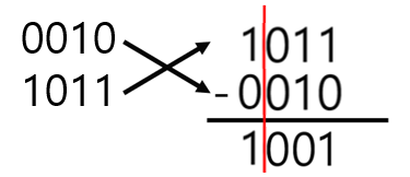 (b) 부호가 다른 부호비트는 가산기(덧셈기)로는 구할 수 없다. 아래와 같이 감산기(뺄셈기)를 사용해야 한다. 단, 피감수가 감수보다 작으므로 둘의 순서를 바꿔서 계산해야 한다.