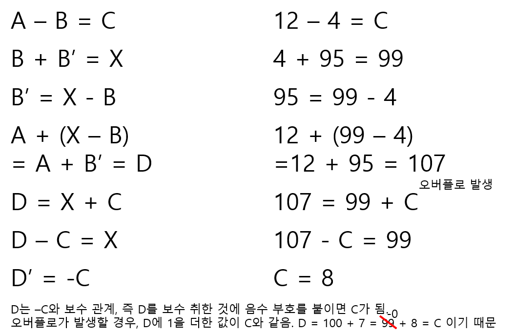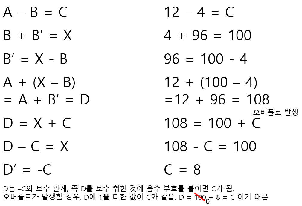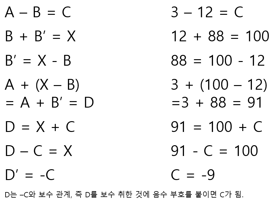 ④ 만약 합이 최대자릿수를 넘어가지 않는다면, 합을 보수처리한 것의 음수값이 결과이다.