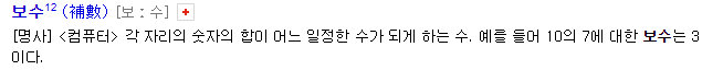 ㉠ 보수는 아래의 네이버 사전에 명시된 것처럼, 각 자리의 숫자의 합이 어느 일정한 수가 되게 하는 수이다.