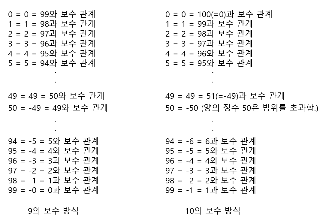 ⓑ 10의 보수 방식은 0을 0으로 취급하며, 음의 0이 존재하지 않기 때문에 음의 정수의 폭이 더 넓다.