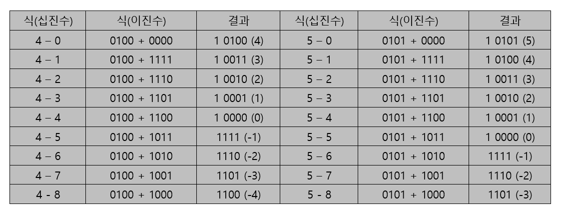 ⓑ 예를 들어 0000(0)을 2의 보수처리하면, 1111에 +1을 해줘서 1 0000이 된다. 최상위 비트에서 캐리가 발생했기 때문에 캐리된 수인 1은 무시된다. 결국 0000(0)이 된다.