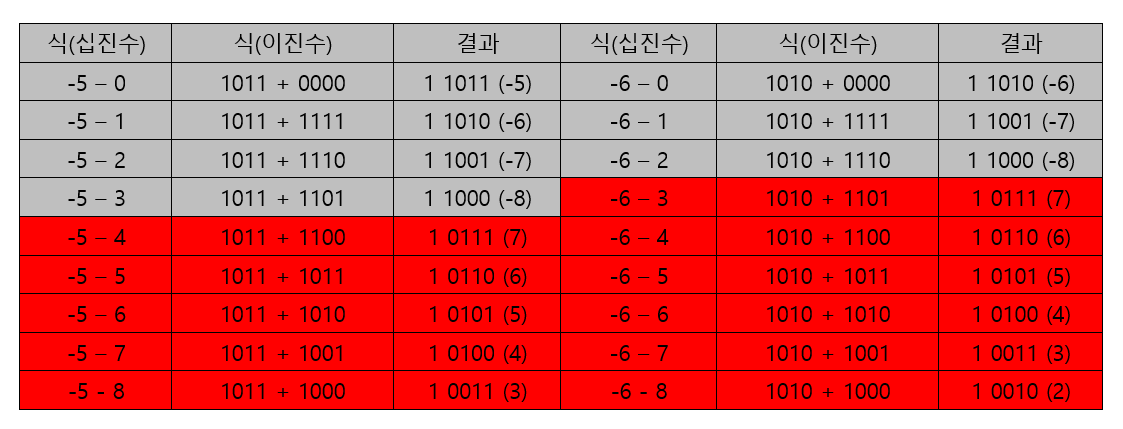 ㉡ 표의 계산에서 문제가 생기는 상황들의 공통점은 최상위 비트에서 캐리가 발생한다는 것이다.
